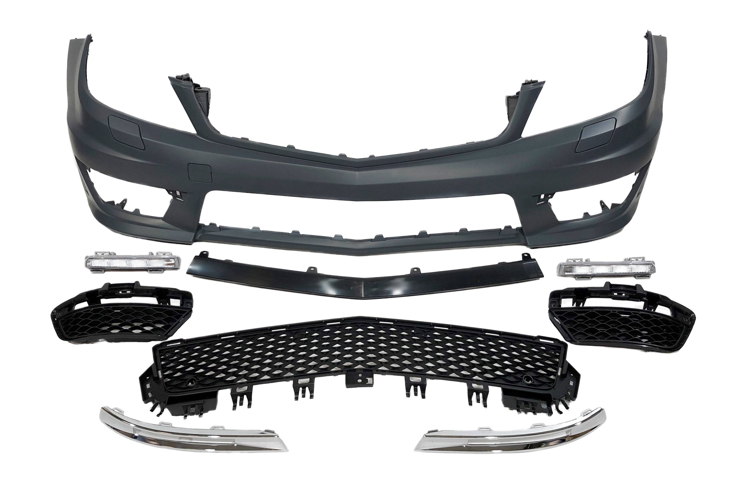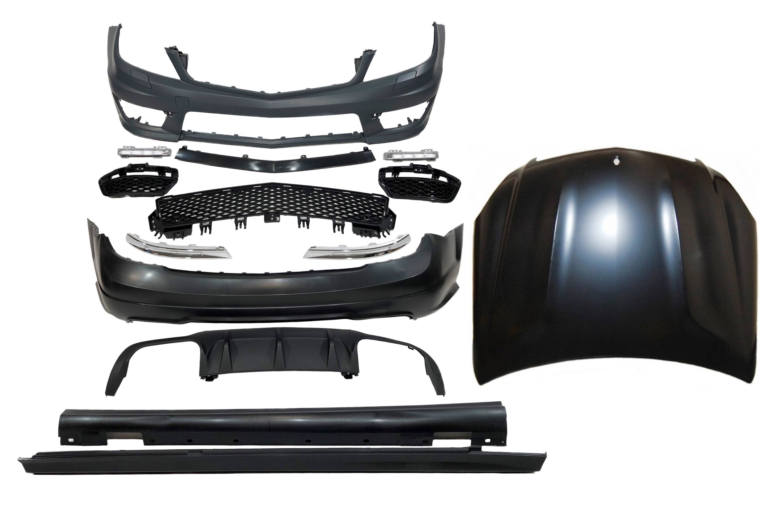 Conjunto de paragolpes delanteros, paragolpes trasero, taloneras y capó para el Mercedes W204 2007-2013.